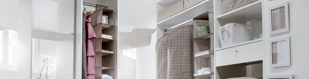 Un motivo a pois bianchi su sfondo color talpa dona fascino alla collezione Rivoli. Un bel modo per organizzare camerino e camera da letto con una linea perfettamente coordinata: custodie, ripiani mobili, divisori che Compactor combina con grucce, scatole e cestini per ritirare e proteggere i tuoi vestiti o la biancheria della tua casa con stile.