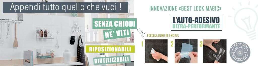 Scopri gli accessori a muro attacca-stacca Bestlock Magic ! Super semplici nell’utilizzo, non dovrai forare, incollare o usare viti. Riposizionabiili e riutilizzabili, questi ganci attacca-stacca sono rivoluzionari per il tuo guardaroba e ti permetteranno di avere a portata di mano anche borse, cravatte e pantaloni grazie a supporti specifici per ogni utilizzo.